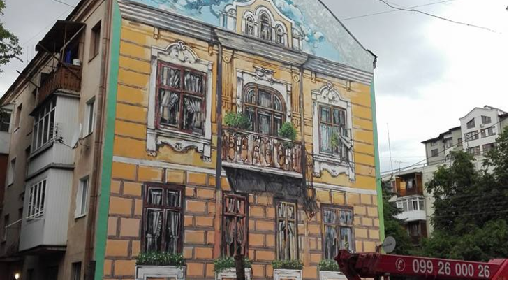 На фасаді хрущовки з’явився малюнок австрійської камяниці, яку зруйнували для будівництва житлового будинку.  Про це повідомляє МІСТО з посиланням на “Побудовано“.