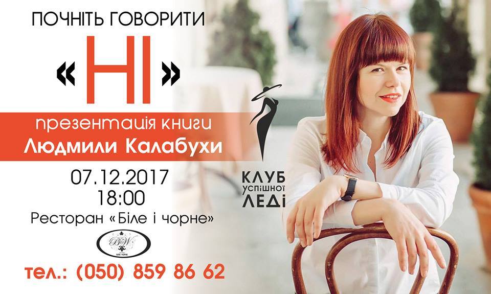 Людмила Калабуха відповість і на запитання учасників, яких також чекають розіграш та подарунки. Крім того, на заході буде унікальна можливість придбати книгу автора «Почніть говорити «НІ» з автографом.
