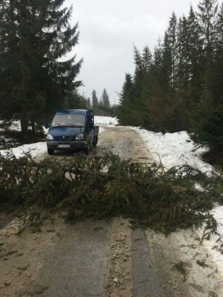 У високогір’ї Карпат ураганні вітри виривають з корінням високі хвойні дерева. Вони падають на проїжджу частину.