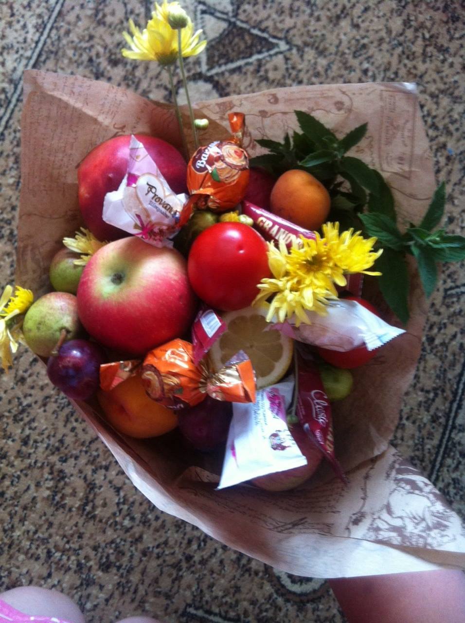 Із одним замовленням пані Наталя може впоратися за три-чотири години роботи. Ціни таких подарунків стартують від 250 гривень і вище. Усе залежить від того, які продукти вона використовує для букета.