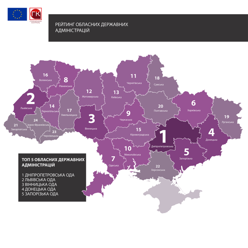 Громадська організація “Громадський контроль” склала рейтинг прозорості публічних закупівель, які впродовж 2017 проводили обласні державні адміністрації України. Сумарно всі обласні та районні адміністрації провели закупівель на 46 млрд грн. За усіма показниками “Громадський контроль виділив 5 кращих та 5 гірших ОДА для ведення бізнесу з державою. Кращими адміністраціями згідно досліджень визнано: Дніпропетровську, Львівську, Вінницьку, Донецьку та Запорізьку. Найгірші ОДА: Полтавська, Закарпатська, Херсонська, Чернівецька, Івано-Франківська.