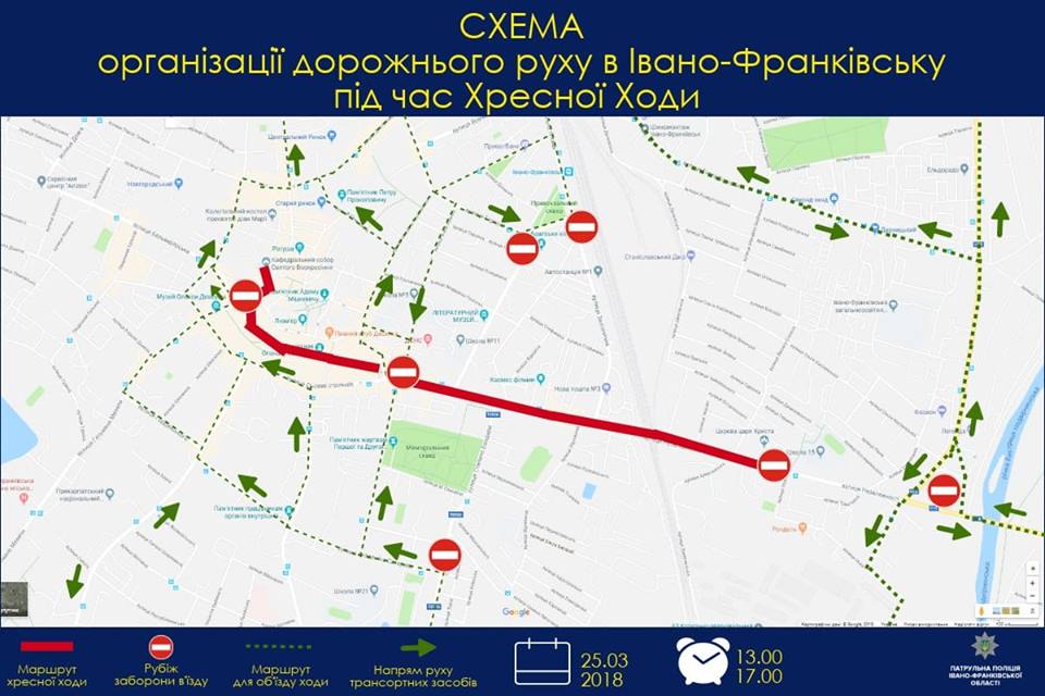 Патрульна поліція Івано-Франківської області попереджає про перекриття руху транспорту та обмеження його паркування за маршрутом Хресної Дороги, яка відбудеться у неділю, 25 березня.