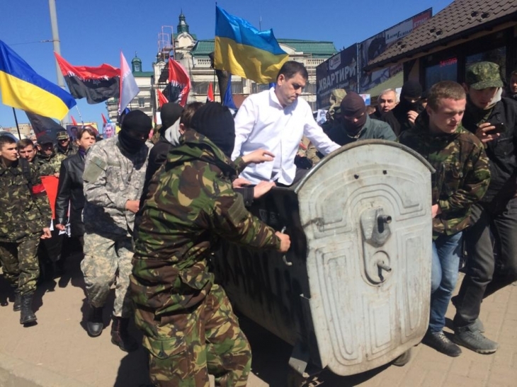 Коли терпіння людей луснуло — прислужника Януковича посадили в сміттєвий бак та облили зеленкою. Тільки після цього обласна рада прийняла рішення про заборону діяльності Кавацюка та звільнила регіонала з посади.