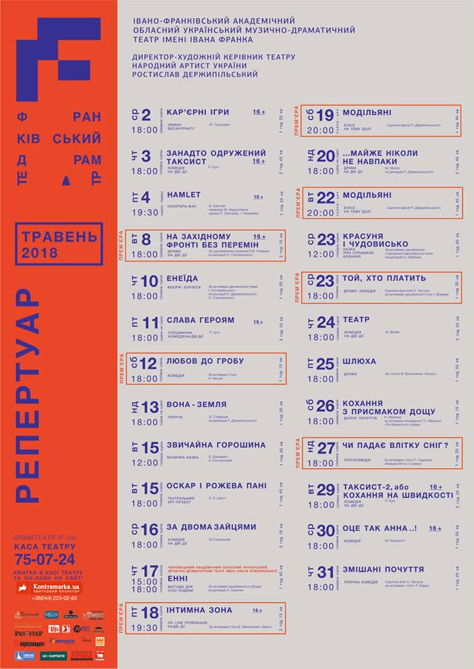 У травні Івано-Франківський облмуздрамтеатр, що на Незалежності, 42, зіграє 25 вистав.