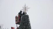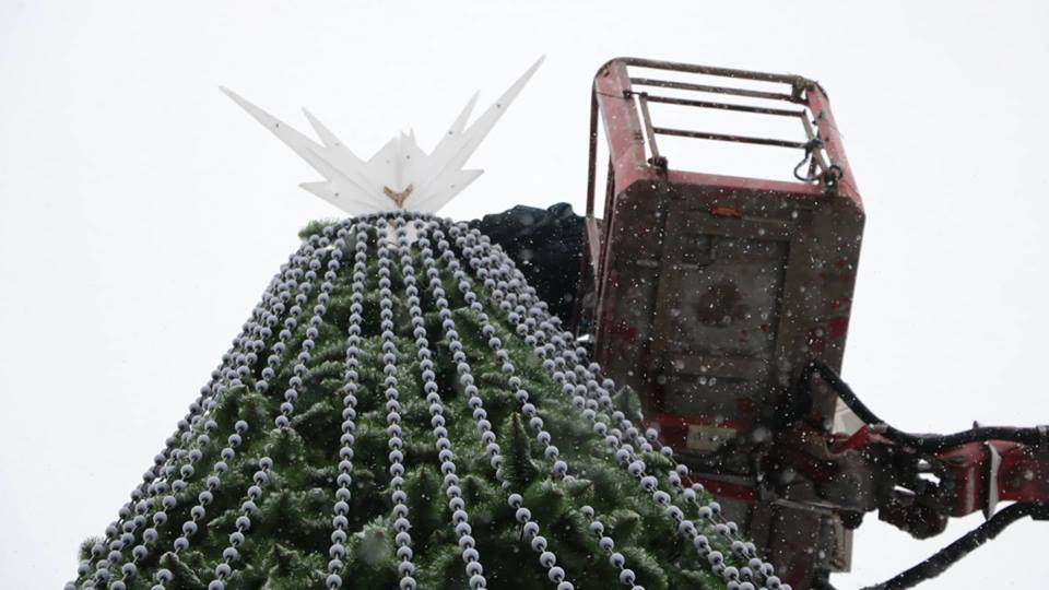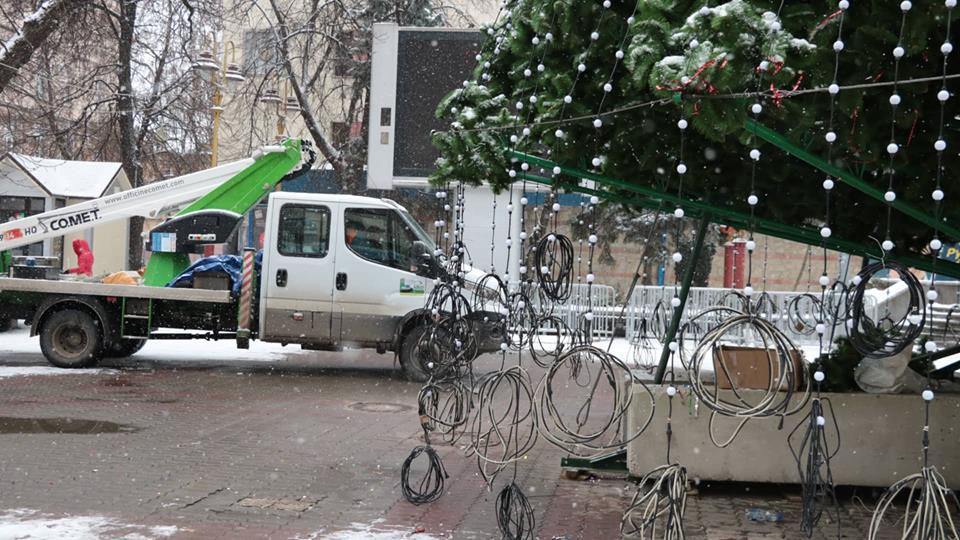 У центрі міста на Вічевому майдані працює техніка для демонтування головної ялинки міста. Також згодом знімуть і святкову ілюмінацію.