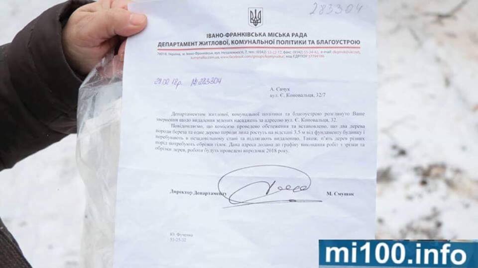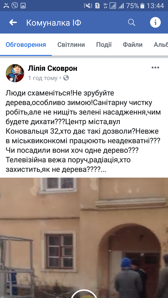 Люди схаменіться! Не зрубуйте дерева, особливо зимою! Санітарну чистку робіть, але не нищіть зелені насадження, чим будете дихати??? Центр міста, вул Коновальця 32, хто дає такі дозволи?Невже в міськвиконкомі працюють неадекватні??? Чи посадили вони хоч одне дерево???Телевізійна вежа поруч,радіація,хто захистить,як не дерева????… – зазначила у спільноті Лілія Сковрон.
