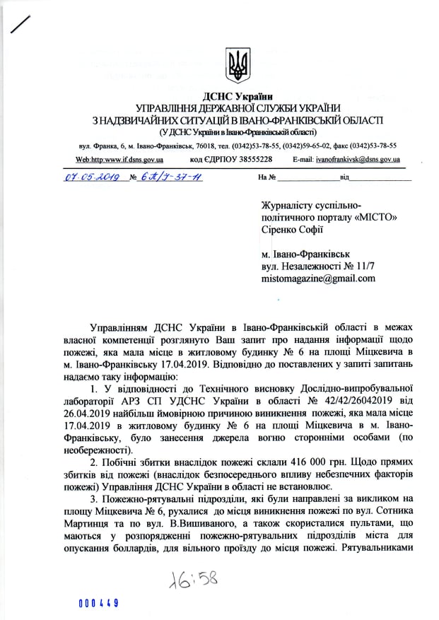 17 квітня близько третьої ночі загорілося горище житлового будинку на площі Міцкевича, 6. Мешканці викликали пожежних. До місця виїхали рятувальники не лише з частини №1 міста Івано-Франківськ, але й частини спеціальної пожежної техніки аварійно-рятувального загону спеціального призначення Управління ДСНС в області. За офіційними даними ДСНС вони евакуювали двох людей та одну порятували. О 5:12 пожежу локалізували, а о 6:03 – ліквідували. Вогонь знищив покриття будинку площею 150 м. кв.