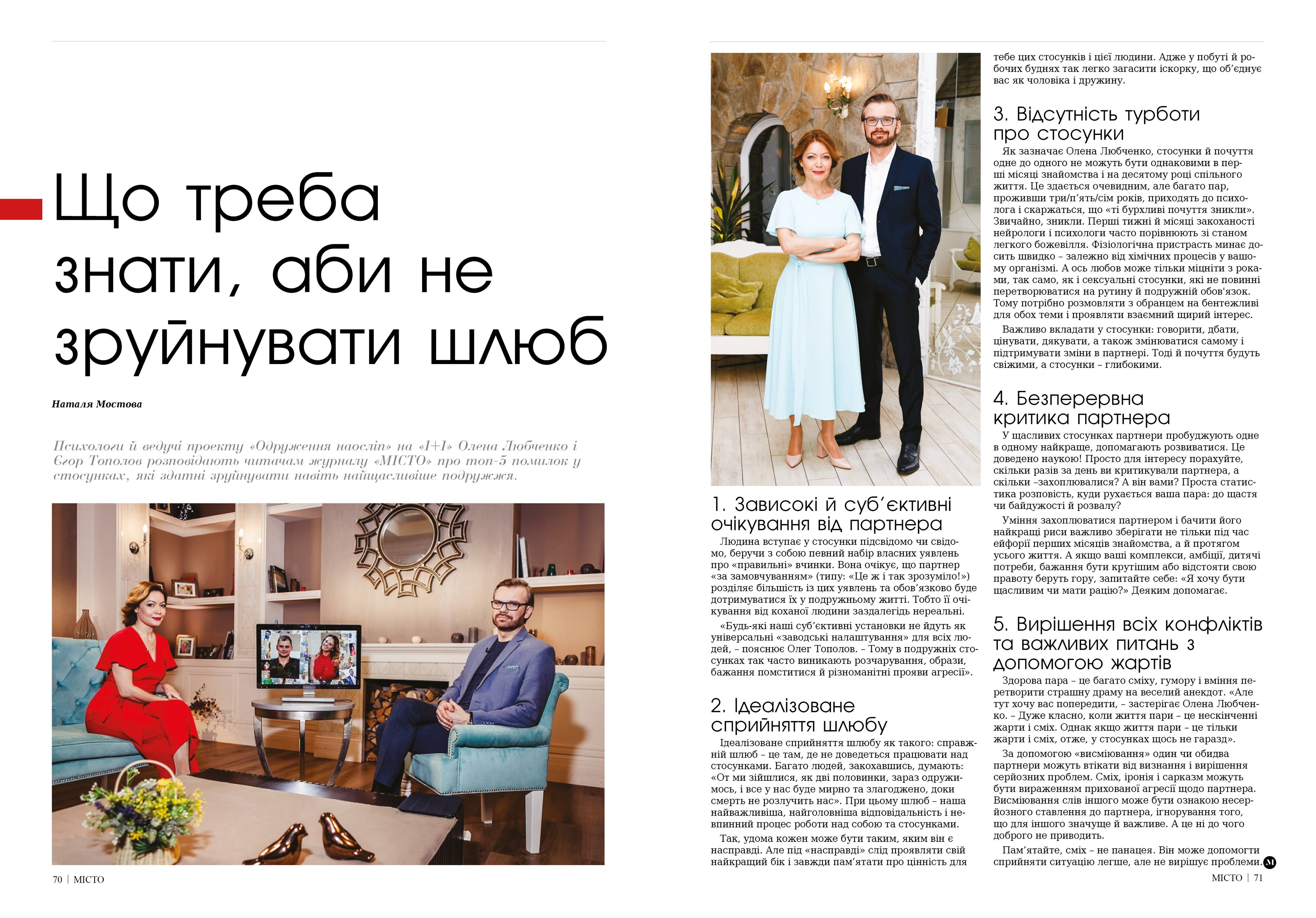Метелики в животі та палкі клятви у вічному коханні. Таке відбувається чи не з кожною парою,яка бере шлюб. Однак у стосунках не все так солодко. Про топ-5 помилок, які здатні зруйнувати навіть найщасливіше подружжя,від психологів та ведучих проекту «Одруження наосліп» на «1+1″ на сторінках міста.