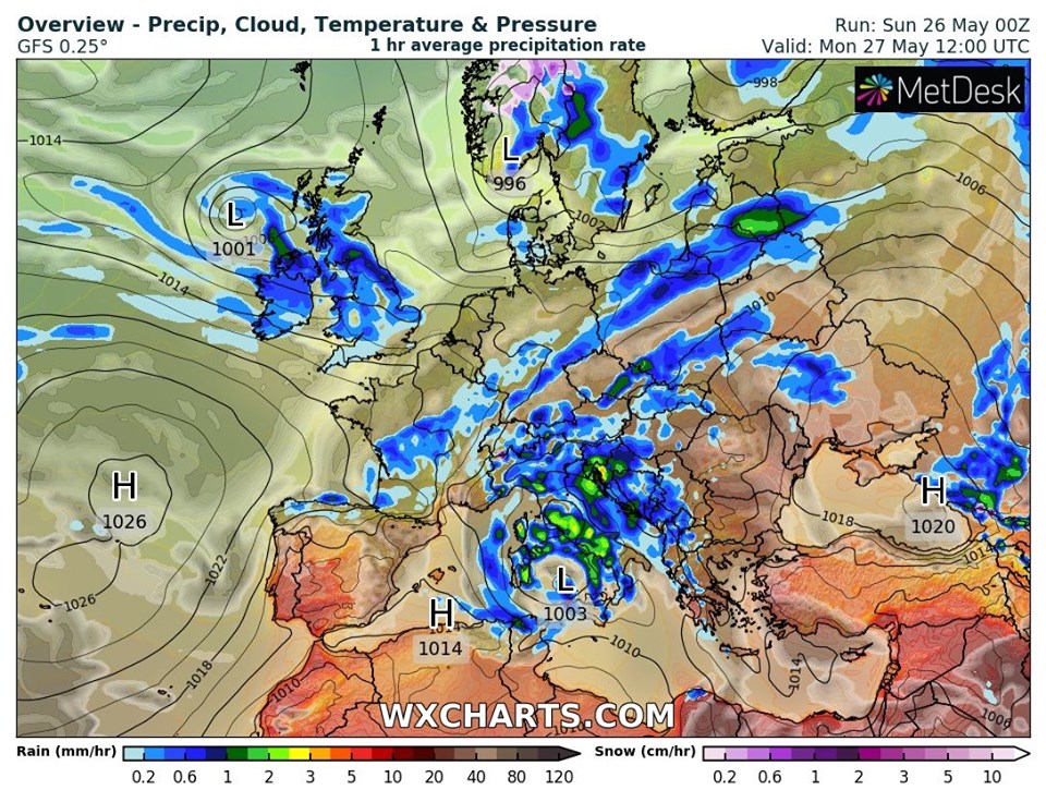 Завтра, 27 травня, синоптики прогнозують дощі та грози в західних областях, а температура вдень становитиме 24-27 °.