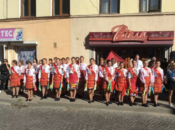 Студентки педагогічного коледжу в урочистому січовому одязі під звуки духового оркестру виконали січові руханкові вправи.