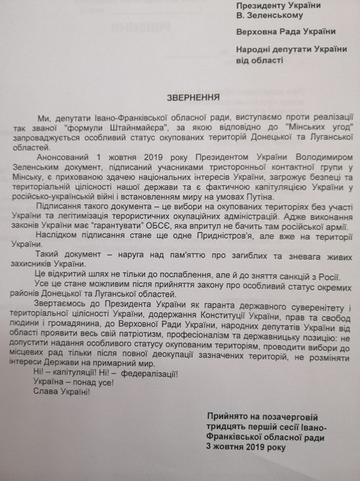 Івано-Франківська облрада вимагає в Зеленського зупинити капітуляцію. ТЕКСТ ЗВЕРНЕННЯ