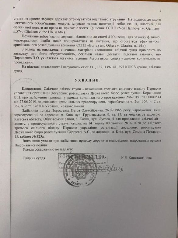 В іншій ухвалі йдеться про привід Порошенка як свідка на допит до ДБР на 14:00 6 березня.