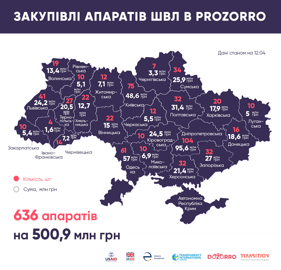 Найбільше апаратів ШВЛ закупили в Дніпропетровській (104), Київській (75), Одеській (61) і Львівській (41) областях.  По 10 апаратів закупили у Закарпатській, Рівненській, Кіровоградській, Миколаївській та Луганській областях.