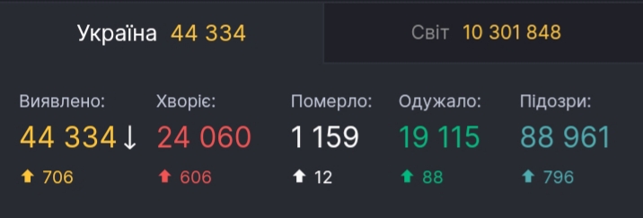 В Україні виявили 44334 хворих, 1159 померли, 19115 одужали.