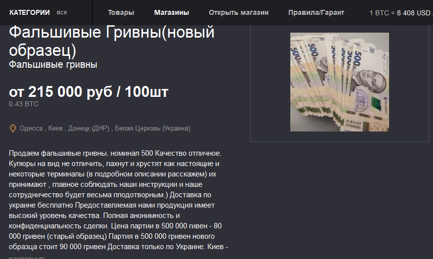 Розрахунок проводиться в електронній валюті Bitcoin. Переважно продають гривні, надруковані на сході України, у так званих Донецькій та Луганській народних республіках. Продавці запевняють, що їхні фальшивки віддруковані на оригінальних верстатах і нічим не відрізняються від справжніх.
