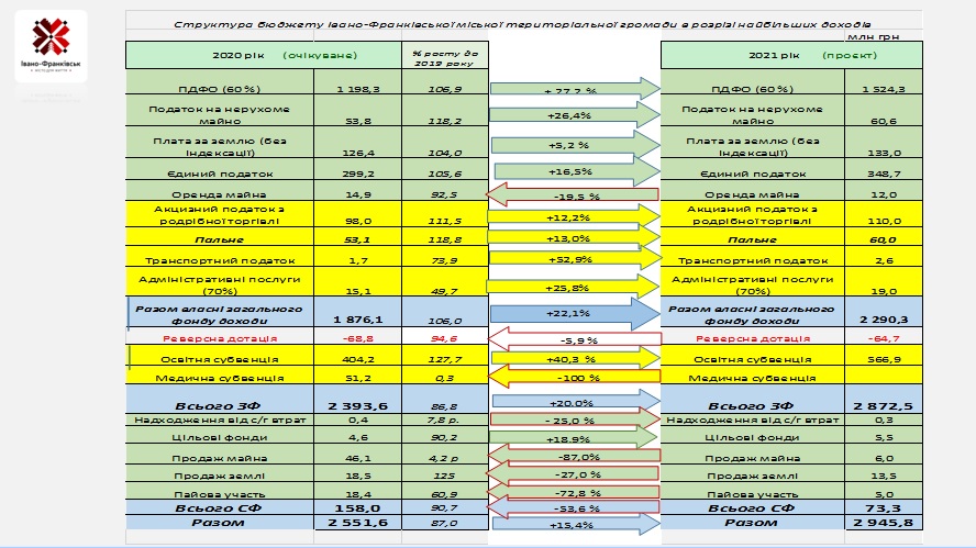 «Свого часу була дуже велика напруга, чи буде на місцях залишатись акцизний податок на пальне. Завдяки народним депутатам наступного року місто матиме додаткових 45 мільйонів. Позитивом є також те, що 60% відрахувань ПДФО залишено місцевим бюджетам. Однак, 35 мільйонів гривень втратить бюджет Івано-Франківської міської територіальної громади в наступному році через відміну пайової участі у розвитку інфраструктури населених пунктів. Це кошти, які забудовники сплачували в місцеві бюджети. За них ремонтувалися школи, садки, дороги тощо. Ще 6,4 мільйона гривень – втрати міського бюджету у 2021 році зв’язку з відсутністю з 2018 по 2023 роки індексації нормативно грошової оцінки землі», – розповіла перша заступниця міського голови Вікторія Сусаніна.