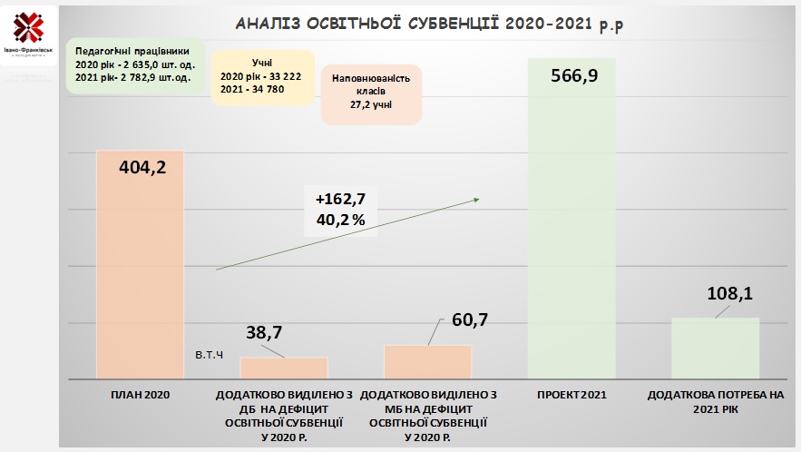Сума коштів, яка не врахована в освітній субвенції для оплати годин індивідуального навчання дітей, ставки вихователів груп продовженого дня та поділу класів на групи при вивченні окремих предметів – 108,1 млн. грн., які теж ляжуть на бюджет громади.