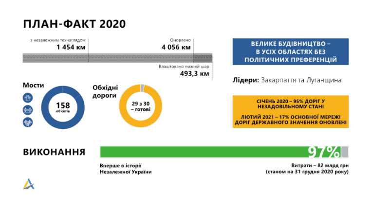 Під час Всеукраїнського Форуму «Україна 30» на панелі «Інфраструктура» голова Укравтодору Олександр Кубраков заявив, що з урахуванням відремонтованих доріг у 2020 році та доріг, які будуть відремонтовані цього року, 37% всієї загальнодержавної дорожньої мережі країни будуть приведені до ладу.