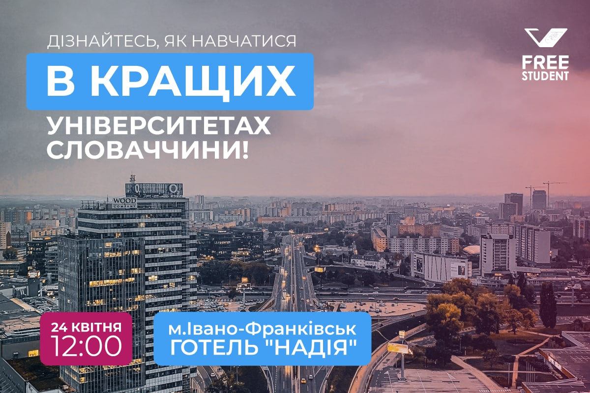 В Івано-Франківську відбудеться презентаційна зустріч програми “FREE STUDENT” з майбутніми студентами та їхніми батьками, на якій можна дізнатися про навчання в Словаччині, а також пройти співбесіду. Презентація відбудеться 24 квітня у конференц-залі готелю “Надія”.