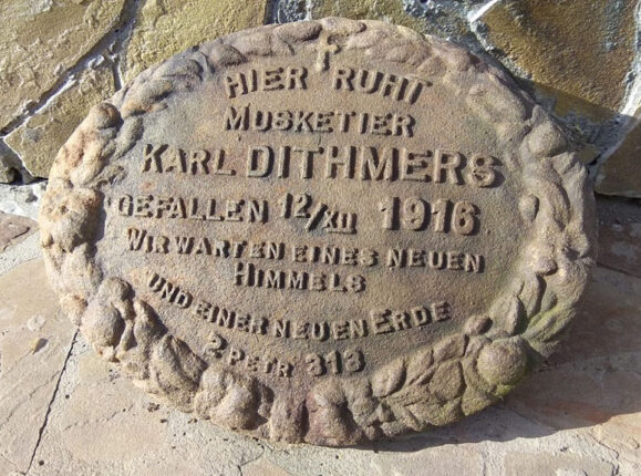 Під час робіт знайшли рештки дерев’яного хреста з могили військовика Першої світової війни, мушкетера німецької імперії Карла Дітмера. Могилу впорядкували. На ній збереглася чавунна еліпсоподібна таблиця з написом: «Hier ruht musketeer Karl DITHMERS gefallen 12/XII 1916 Wir warten eines neuen Himmels und einer neuen Erde 2 petr 3.13.».