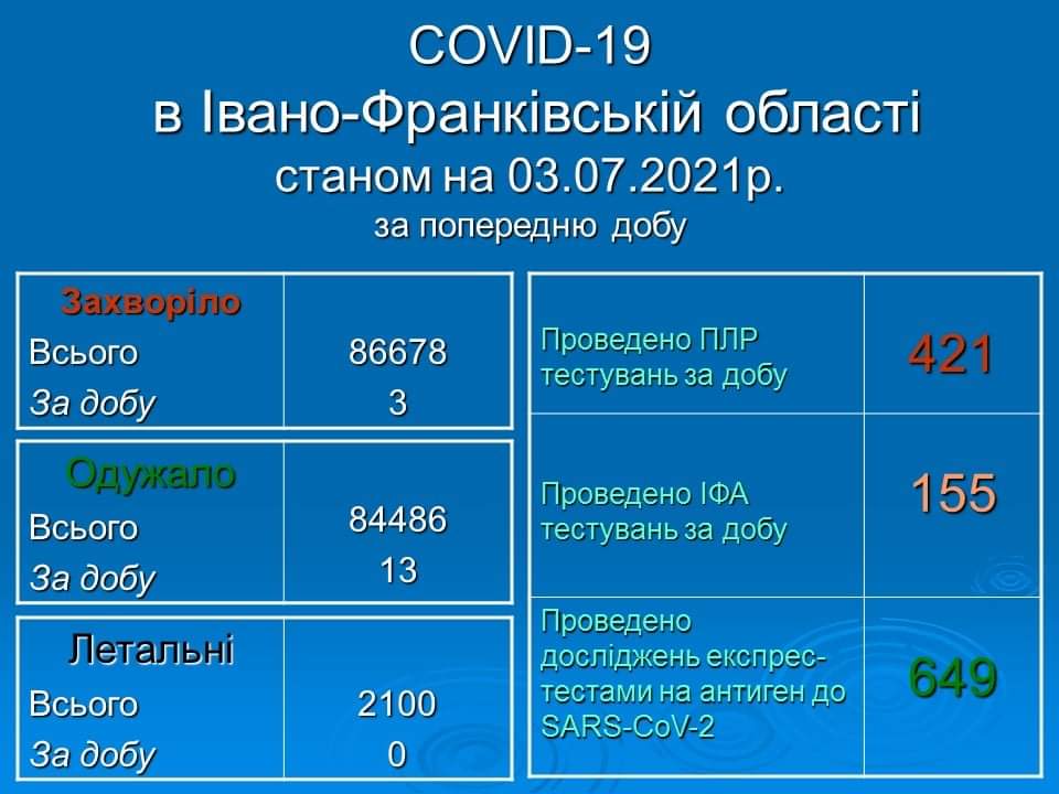 Станом на 03.07.2021р. в Івано-Франківській області протягом попередньої доби зареєстровано 3 нових випадки коронавірусної хвороби COVID-19