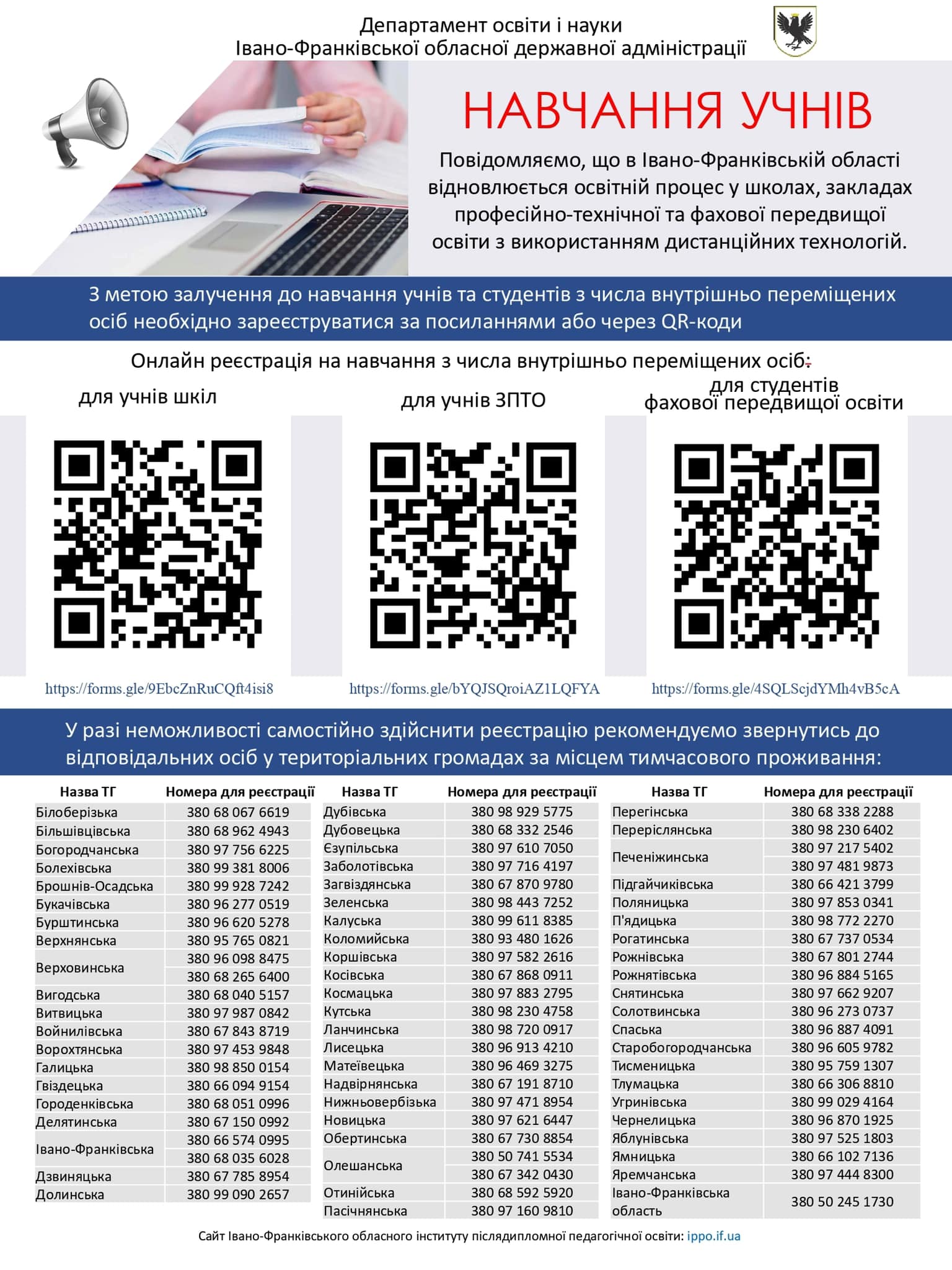 На Прикарпатті стартувала реєстрація на навчання учнів з числа внутрішньо переміщених осіб.