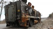 Українські військові знищили російський броньований автомобіль підвищеної захищеності – Камаз “Тайфун”.