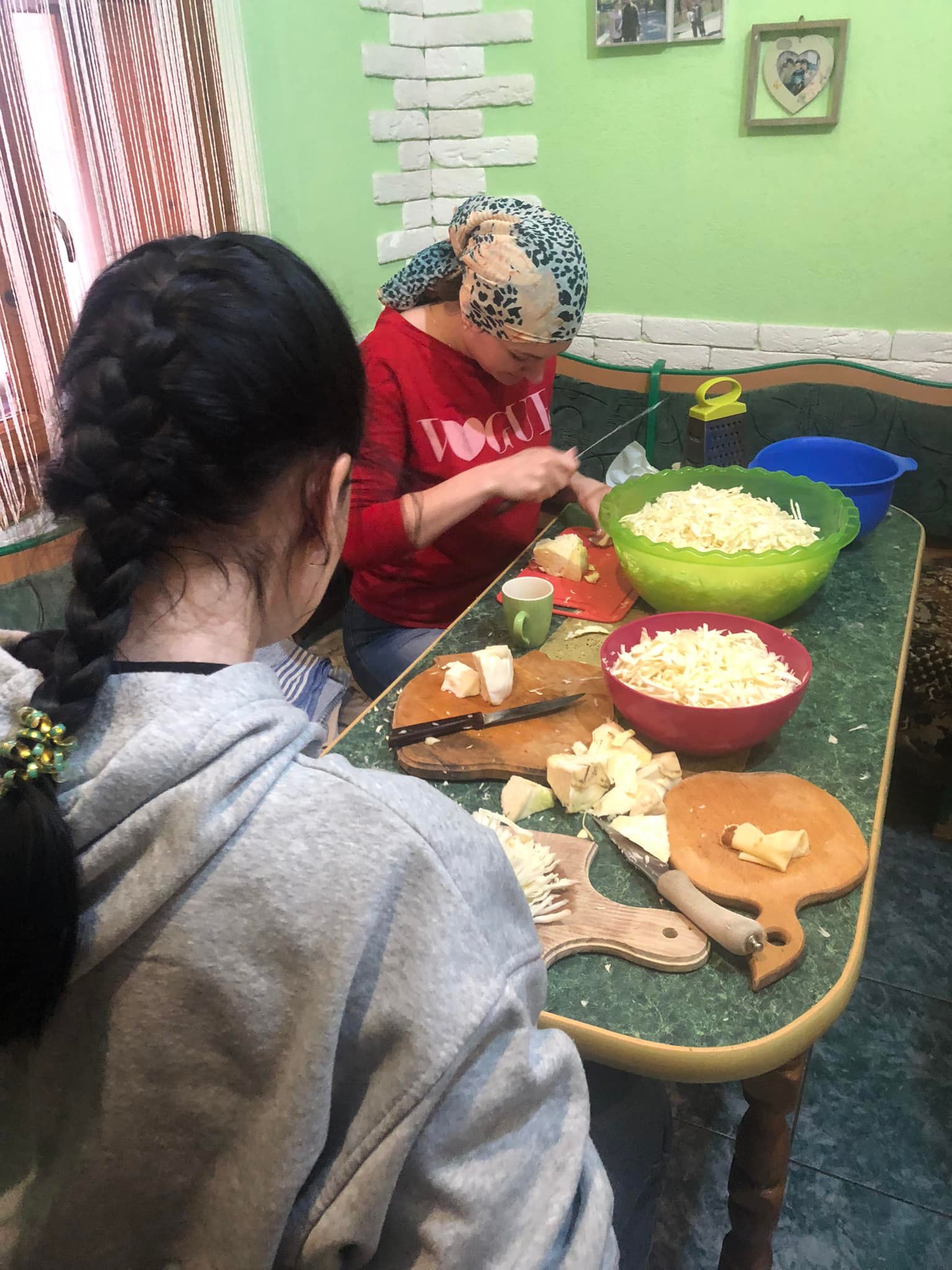 Ксенія Тринцолін, вирішила допомогти із такою стравою, сьогодні вона принесла відварену картоплю та робила начинку і закручувала її. Попередньо жінка ходила разом із мамою на плетіння сіток та вдома сушили інгредієнти на “козацький борщ”. Крім цього, збирали гуманітарну допомогу для свого брата, його побратимів, своїх сусідів та односельчан.