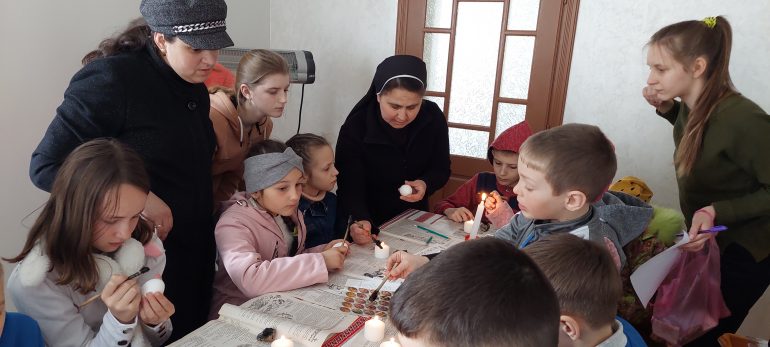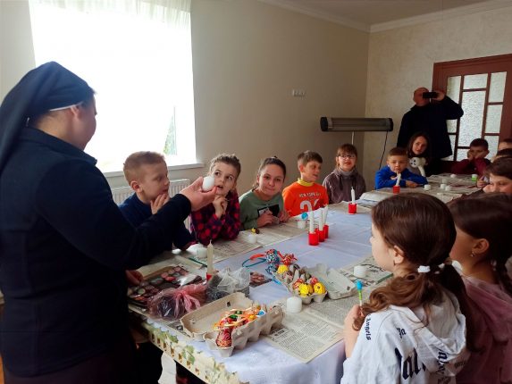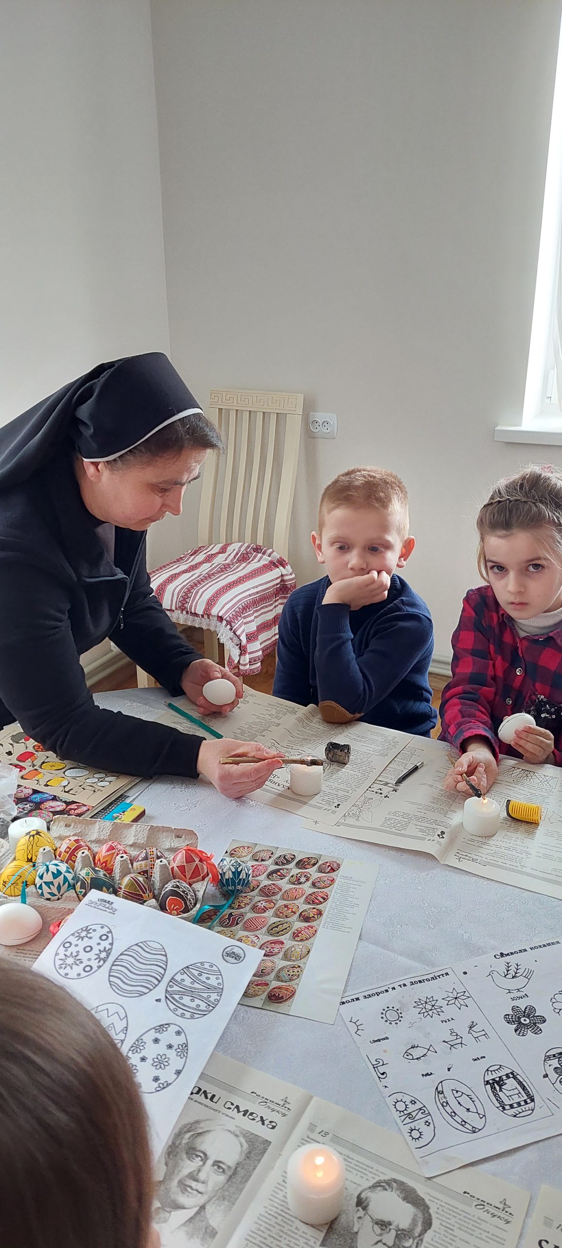 Сестра Теодозія з Богородчан вчила дітей розписувати великодні писанки.