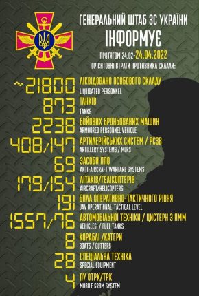 Загальні бойові втрати противника з 24.02 по 24.04 орієнтовно: