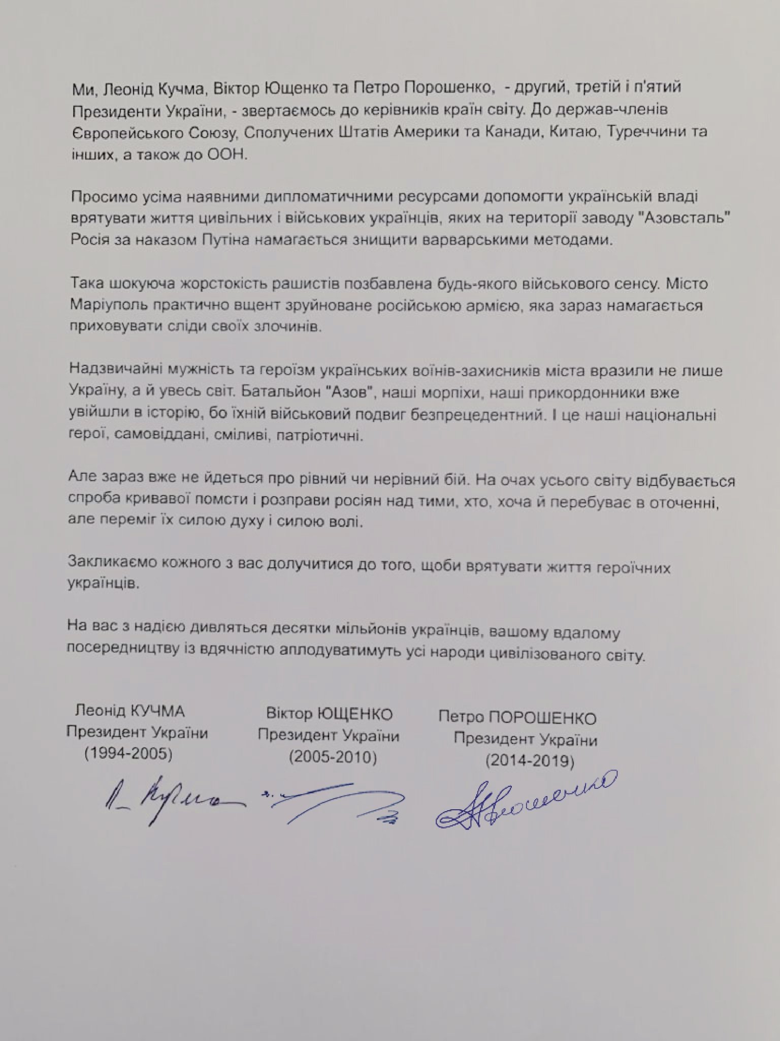 Віктор Ющенко, Леонід Кучма, Віктор Ющенко та Петро Порошенко, – другий, третій і п’ятий Президенти України, звернулися до керівників країн світу. До держав-членів Європейського Союзу, Сполучених Штатів Америки та Канади, Китаю, Туреччини та інших, а також до ООН.