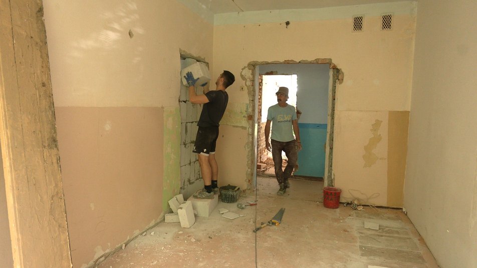 Ремонтувати приміщення волонтери почали 4 липня. Загалом лагодять заклад приблизно 30 людей з різних міст України. Всі — учасники табору руху “Будуємо Україну разом”. Вони працюватимуть тут у п’ять заїздів.
