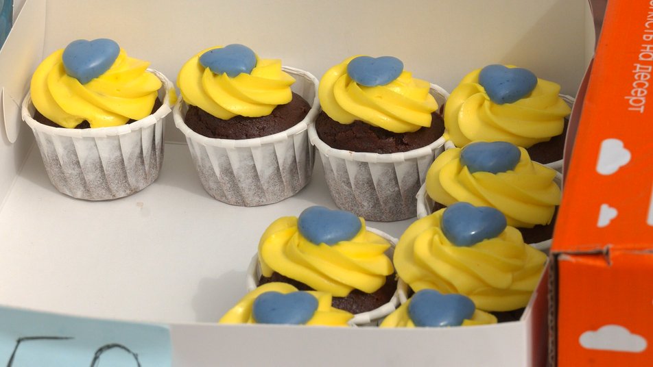 Тарас Василюк прийшов на ярмарок, щоб долучитися до збору грошей та підтримати студентів, які захищають Україну. Чоловік розповідає, вирішив не обмежуватися одним шматочком смаколика, тому придбав цілий вафельний торт.