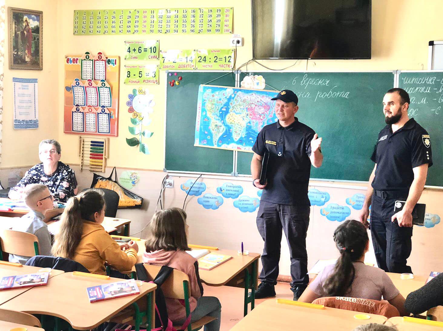 Частина уроку відбулася в шкільних укриттях. Поліцейські наголосили дітям, що необхідно дотримуватись сигналів повітряної тривоги. Адже це може врятувати їхні життя.