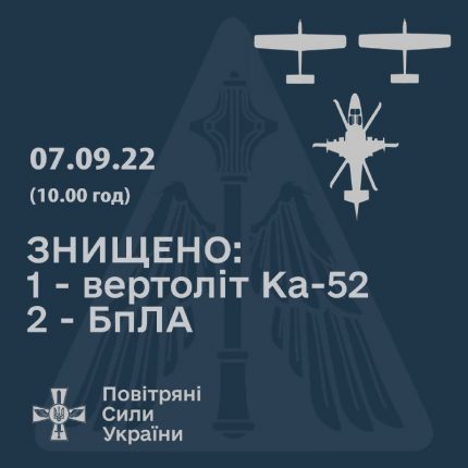 Сьогодні, 7 вересня, близько 8:30 ранку, у небі Херсонщини зенітним ракетним підрозділом Повітряних Сил збито російський ударний вертоліт Ка-52 “Алігатор”.