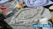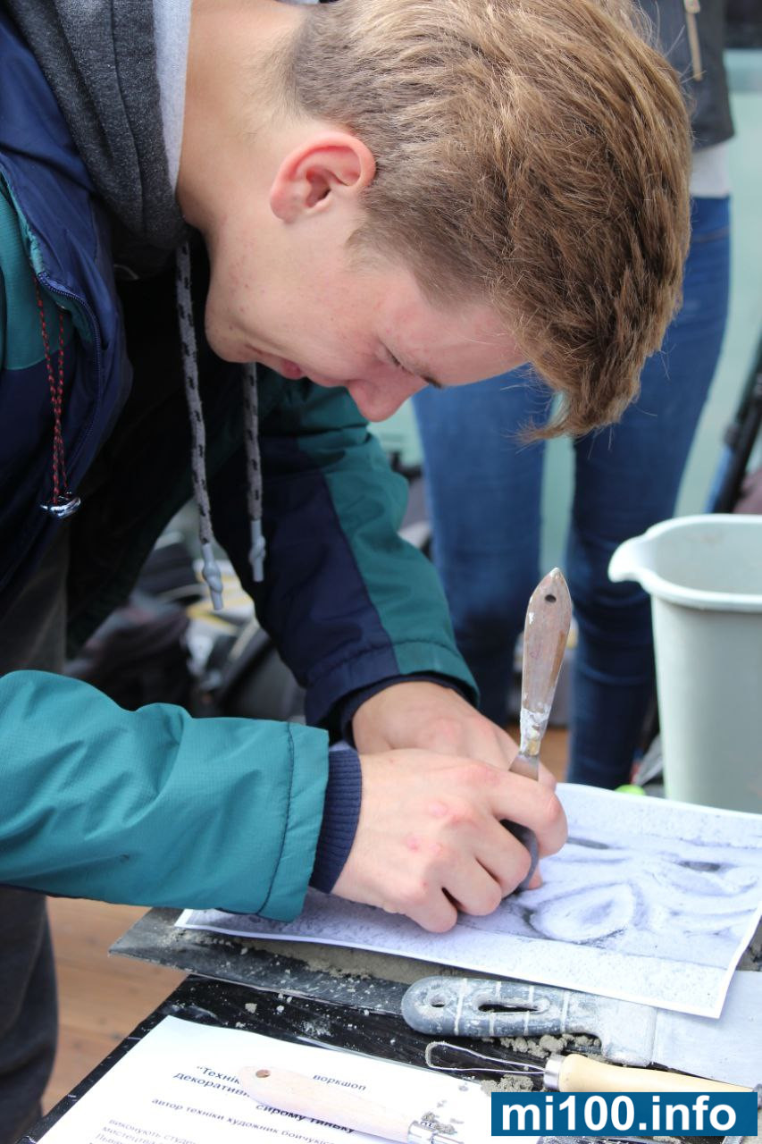 На відкритті відбувся також воркшоп із різьблення по сирому тиньку. Франківець спробував попрацювати із цією технікою.