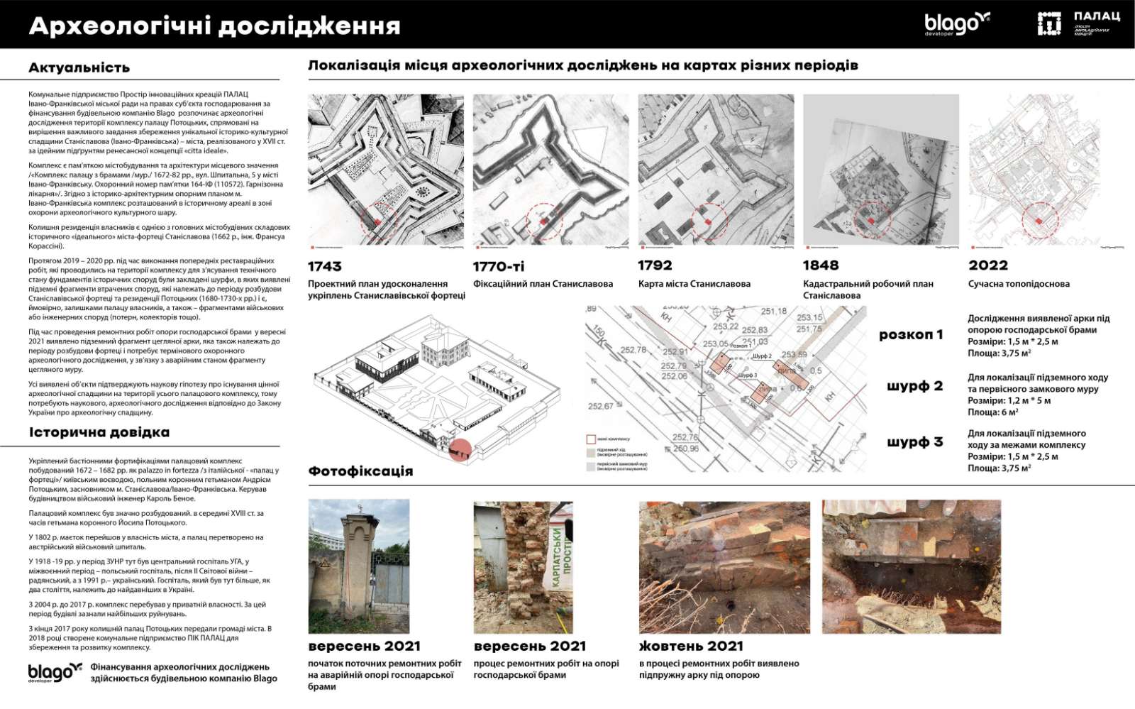 Комплекс колишнього палацу Потоцьких – всім добре знане місце у центральній частині Івано-Франківська. Історичні будівлі дійшли до наших днів зі слідами багаторазових трансформацій і руйнувань та мають неабияку історичну та культурну цінність. Це спадщина палацового та госпітального етапів функціонування комплексу не лише для міста, а й для Європи. Та через певні історичні особливості, пов’язані з власністю та використанням, як об’єкта з обмеженим доступом, його історія досі залишається таємницею, розгадати яку і взялися ініціатори дослідження – КП ПІК «ПАЛАЦ». Раніше спеціальних археологічних розкопок на території Комплексу не проводилося, тому виявлені під землею археологічні залишки будівель стануть цінною знахідкою для Івано-Франківська.