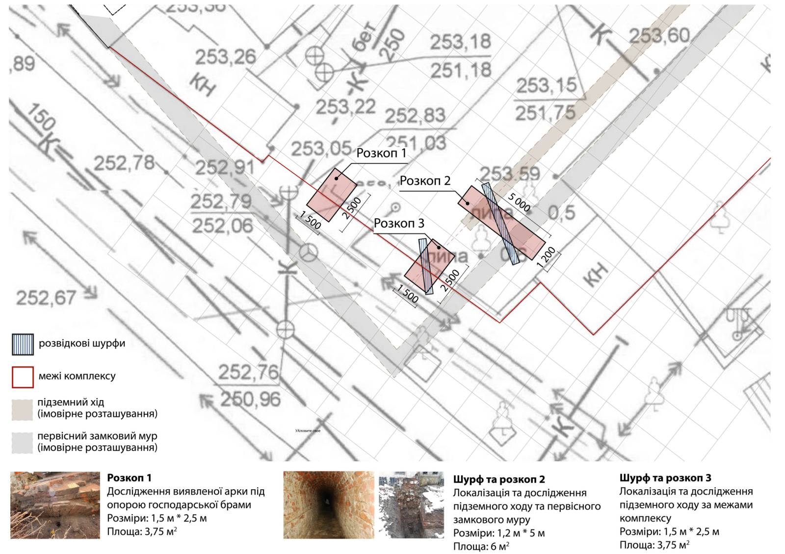 Розкопки на першому етапі будуть вестися в кілька черг, перша з яких буде стосуватися господарської брами, території з обох боків біля брами та огорожі. Другою чергою буде закладено один з шурфів для дослідження підземного ходу і фундаментів муру біля корпусу З. Наступним етапом, згідно з програмою, планується досліджувати центральне і праве крило палацу, суміжно з корпусом Ж, під якими ймовірно, є підземна частина палацу із його фундаментом.