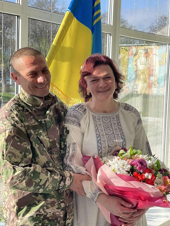 На рушничок щастя стали захисники України Ірина (Діля) та Василь й учасник бойових дій в зоні АТО/ООС Дмитро та його наречена Світлана, повідомив міський голова Андрій Найда.