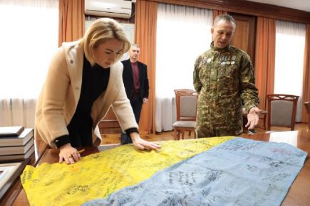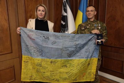“На зустріч зі мною Андрій приніс наш прапор із побажаннями від бійців та видатних людей. Мала за честь також залишити своє побажання для наших незламних воїнів: “Боже, благослови рідну Україну!” Дякую Андрію за службу, за любов до рідної землі”.