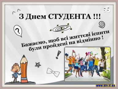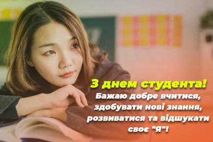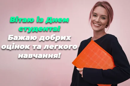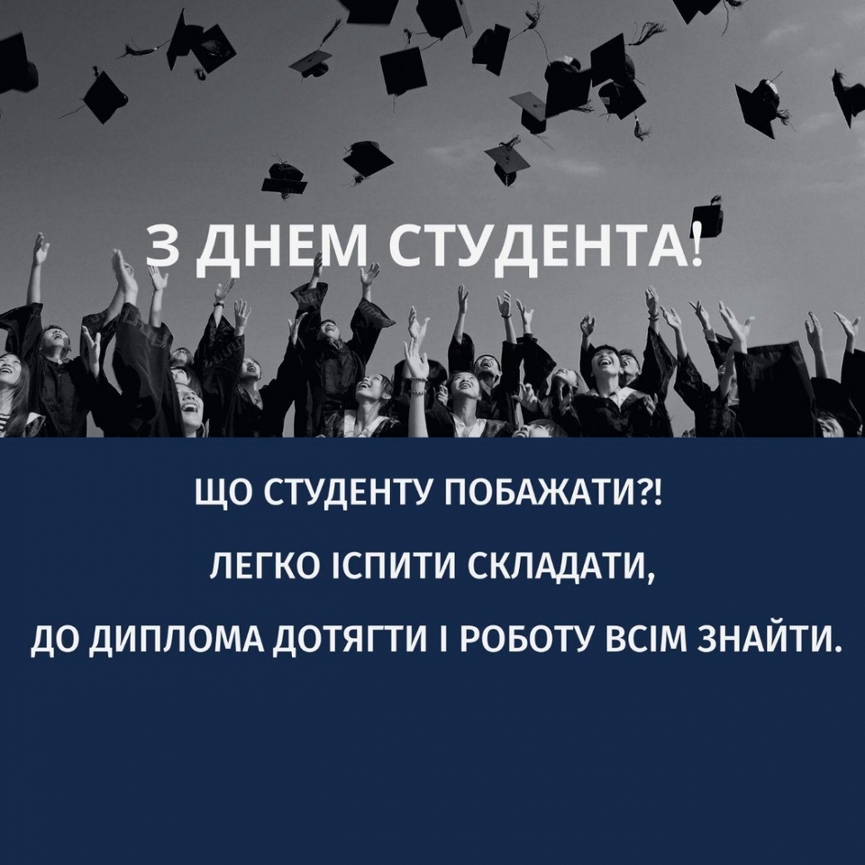 Вітаю з Днем студента! Бажаю яскравих буднів, веселих друзів, продуктивного навчання, успішних іспитів, зданої сесії, лояльних викладачів. Нехай студентські роки стануть найбільш незабутніми і крутими, принесуть знання, диплом, надійну дружбу і позитивні враження!