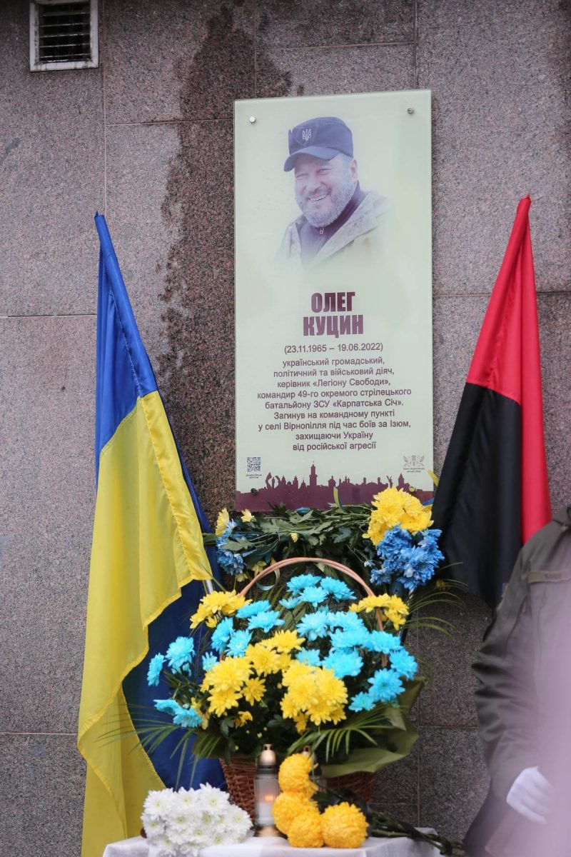 Сьогодні на фасаді Центру патріотичного виховання молоді імені Степана Бандери встановили пам’ятну дошку Олегу Куцину – командиру 49-го стрілецького батальйону «Карпатська Січ» 93-ї ОМБр «Холодний ЯР.