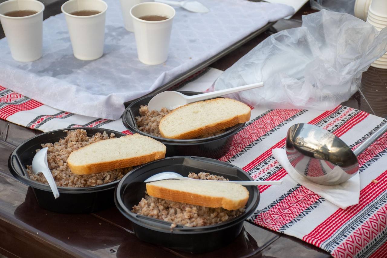 Попри повітряну тривогу, яка затримала майже на годину роздачу харчів, гречкою з м’ясом таки пригостили всіх охочих.