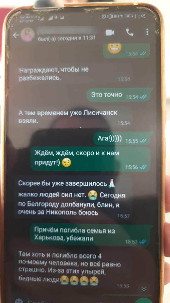 Проте, не дочекавшись приходу «асвабадітєлєй», вона вирішила виїхати до Польщі. Під час перевірки її сторінок у соцмережах прикордонники виявили дописи з проросійськими поглядами.