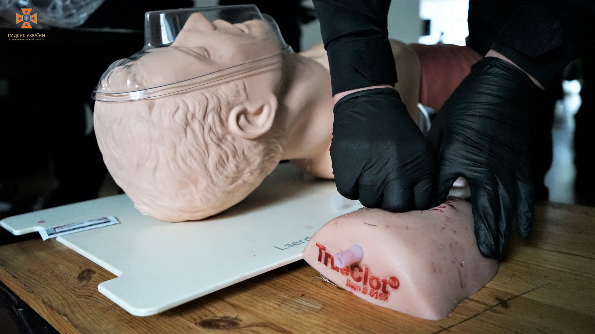 По завершенні навчання, рятувальники здали практичний залік, де в умовній безпечній зоні надавали першу долікарську допомогу при польовому пораненню та зупиняли різного роду кровотечі.