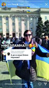 Вперше Олену спробували затримати ще 25 травня. На центральній площі міста вона знімала стрім, російський солдат захотів забрати телефон. Хапав за сумку, за руку. Але натовп був великий, їй вдалося вирватися, не посмів силу застосувати. З того часу вона вже не вела стріми, ще й тому, що підписники все це бачили і просили більше так собою не ризикувати.