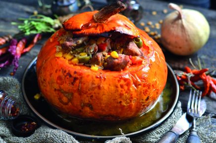 Очистити гарбуз від насіння та м’якуша. Приготувати начинку. Потушкувати м’ясо з цибулею та морквою. Додати приправи: селеру, петрушку. Наповнити гарбуз і зверху накрити вирізаною гарбузовою «кришечкою». Випікати в духовці при 180-200 градусів не менше як пів години.