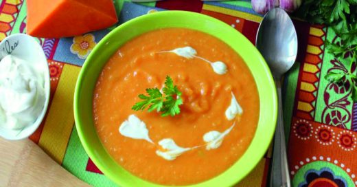 Почищений гарбуз порізати на шматки, відварити. Одночасно посмажити багато цибулі і моркви. Перемолоти в блендері і гарбуз, і попередньо зварене куряче м’ясо, і цибулю з морквою. Готову масу залити м’ясним бульйоном і дати покипіти кілька хвилин. Суп приправити сметаною.