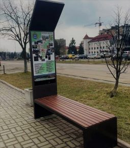 Виготовлена лавка із металу й дерева. Для зручності в конструкцію вбудовано інформаційний стенд з картою громади, на якій позначено популярні туристичні об’єкти, атракції та пішохідний і велосипедний маршрути.