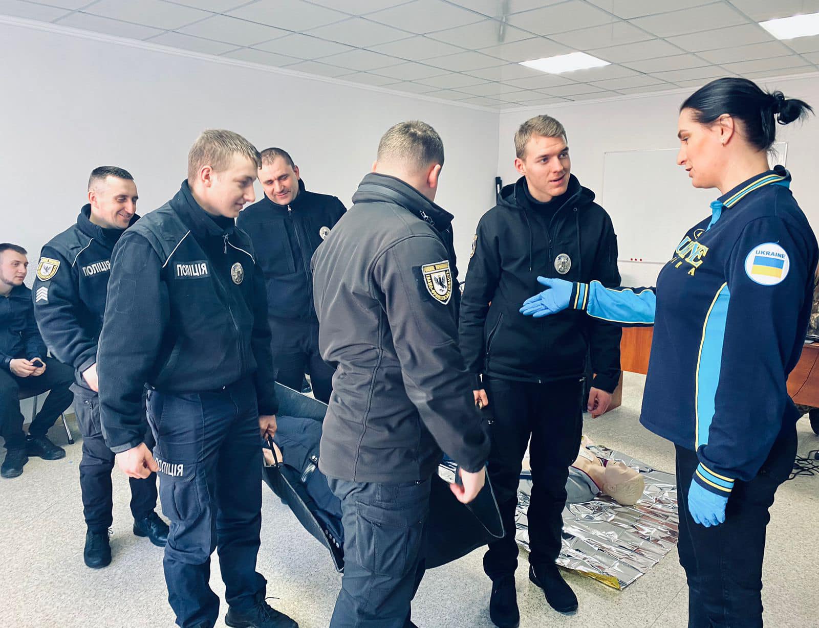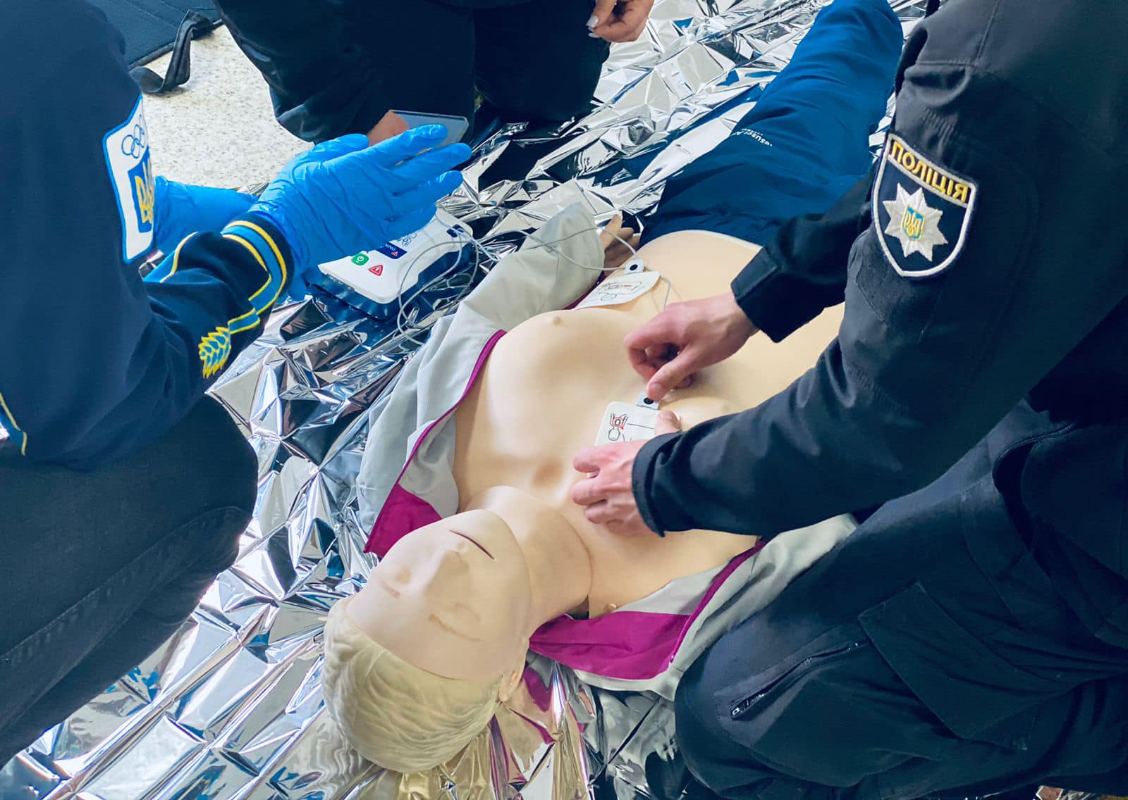 Поліцейські відпрацювали алгоритми зупинки кровотечі та серцево-легеневу реанімацію з апаратом зовнішньої дефібриляції, транспортування потерпілих за допомогою нош, евакуація з місця події тощо. Звернули увагу правоохоронців також на власній безпеці.